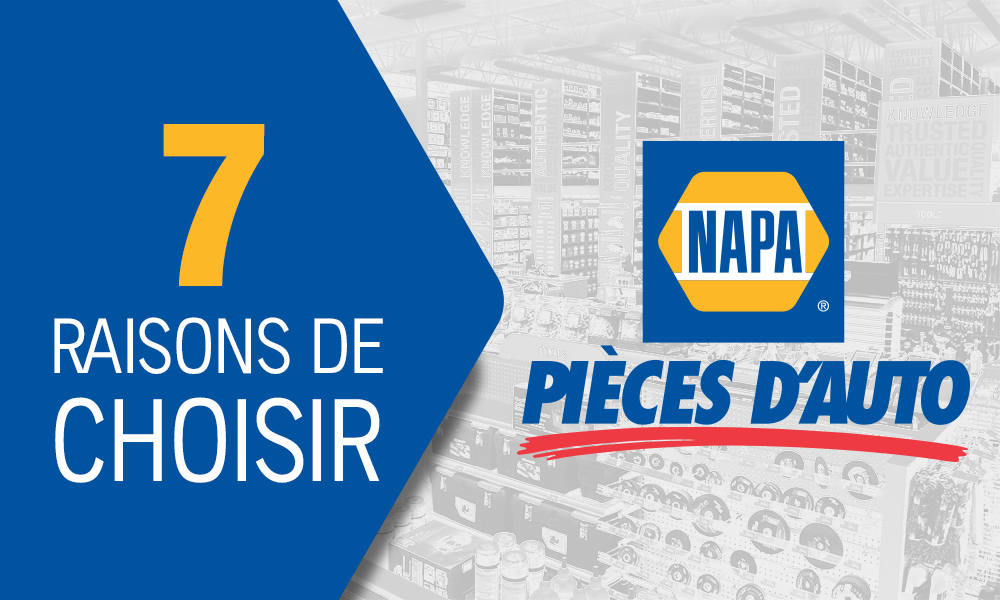 Nous vous présentons sept (7) raisons de choisir NAPA Pièces d’auto pour l’achat de pièces et produits pour l’entretien et la réparation de votre automobile, votre bateau ou votre véhicule récréatif. Vous trouverez également chez NAPA une vaste gamme d’outils et d’équipements pour réaliser vos petits et grands projets.